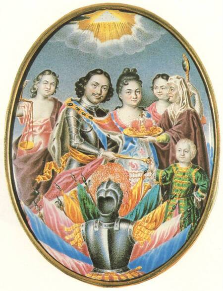На миниатюре «Портрета семьи Петра 1» изображены: Пётр, жена Екатерина Алексеева, две дочери, младший сын от второй супруги и старший сын от первой.