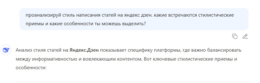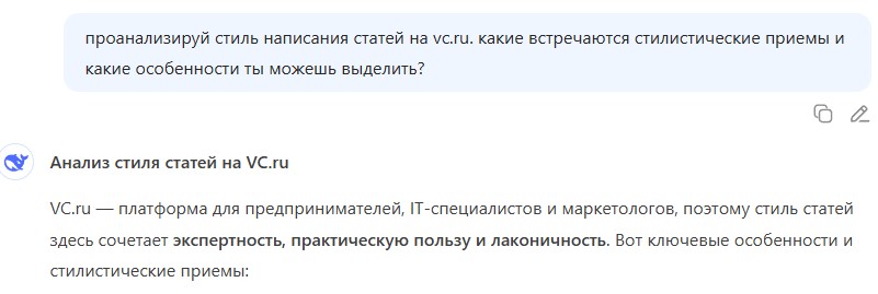 Для начала я попросила нейросеть проанализировать стилистику текстов на интересующих меня платформах. Это было нужно для того, чтобы в дальнейшем при написании моей собственной статьи нейросеть учитывала стилистические особенности каждой из платформ.