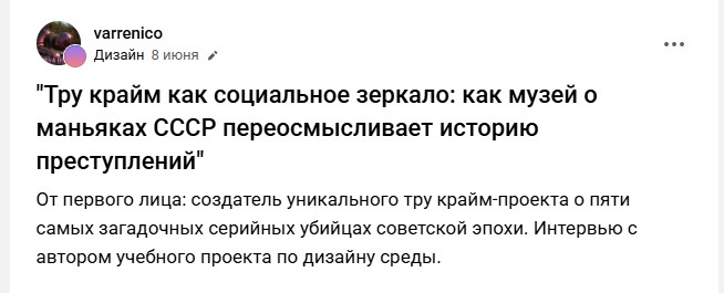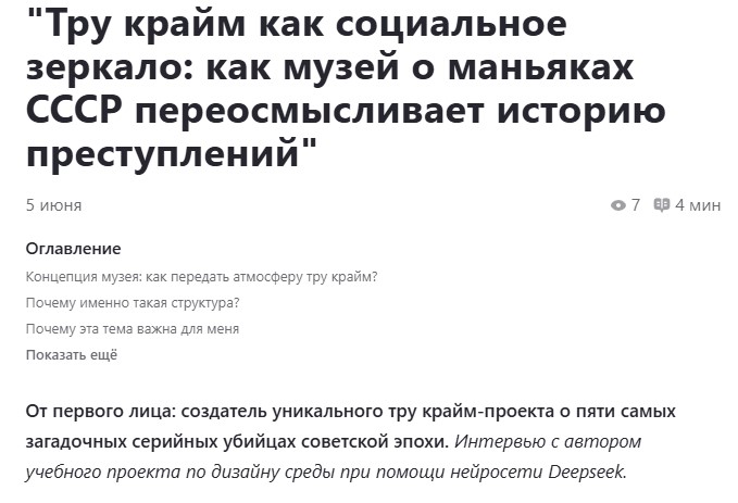 1. Статья на Яндекс.Дзен и VC.ru: «Тру крайм как социальное зеркало: как музей о маньяках СССР переосмысливает историю преступлений»