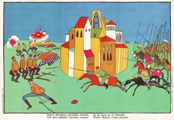Аристарх Лентулов, «Сдал австриец русским Львов, где им зайцам против львов!», литография, 1914