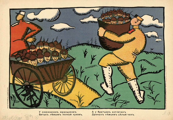 Художник Казимир Малевич, автор текста Владимир Маяковский, «У союзников французов битых немцев полный кузов», 1914 год.