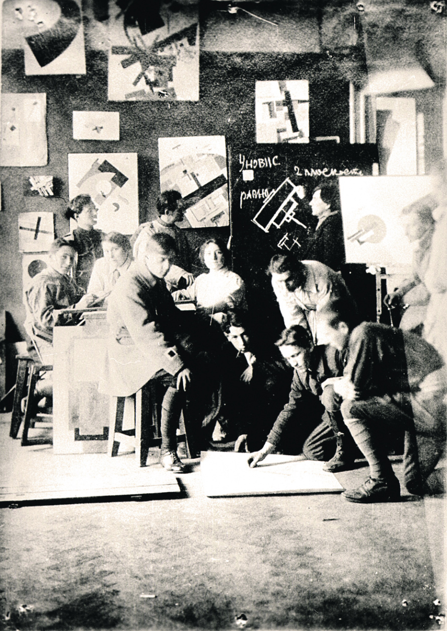 Группа «УНОВИС» за работой, 1920 / Афиша Футуристической выставки «0.10», 1915