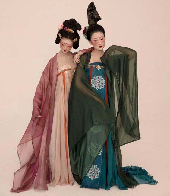 Период Тан считается золотым веком китайской культуры, что что нашло отражение и в костюме. В Тан женщины, наконец, начали открывать, что было выраженно глубоким декольте. Это стало уникальной чертой эпохи Тан. Женщины носили платья с широкими рукавами, юбки и накидки, украшенные сложными орнаментами и яркими красками, демонстрируя многообразие стилей и богатство декоративных элементов.
