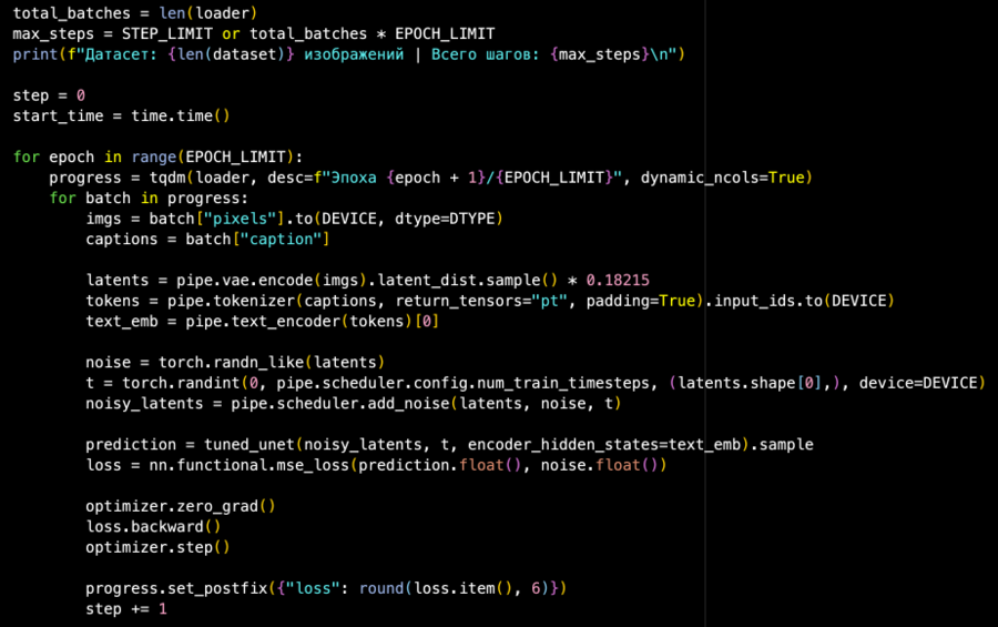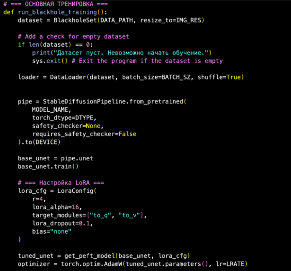 Первый скрипт реализует процесс обучения модели Stable Diffusion с помощью метода LoRA на основе пака изображений чёрных дыр.