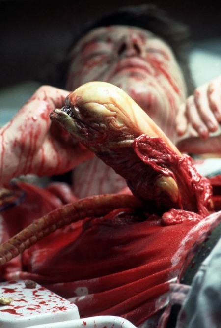 В фильме «Чужой» паразит — это идеальный хищник, нарушающий все биологические границы. Основу ужасающей природы ксеноморфа составляет его жизненный цикл: паразитический лицехват имплантирует эмбрион в жертву, который после скрытной инкубации вырывается наружу через кровавое «рождение», демонстрируя совершенный паразитизм. [6]