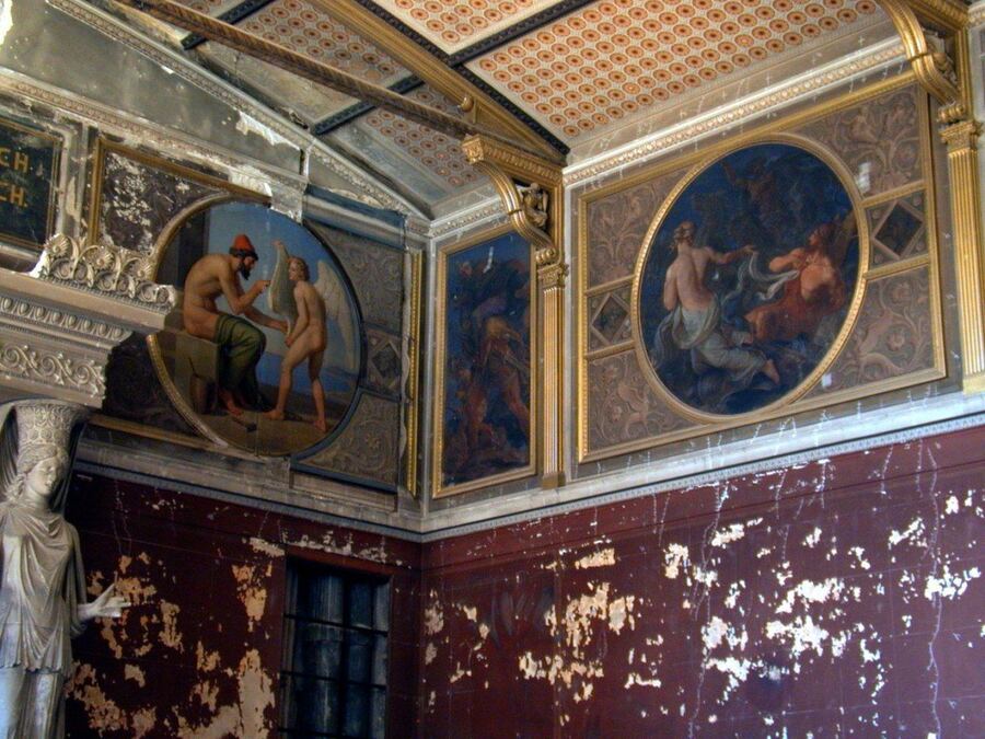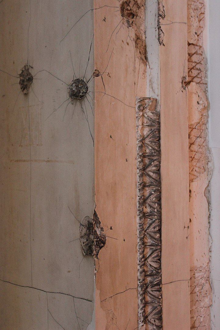 Парадная бетонная лестница в главном холле является центрообразующим элементом, контрастируя с обгоревшими ионическими колоннами. Подобный принцип наблюдается на всей территории внутреннего убранства музея, что лишь подчеркивает ореол многослойной памяти, таящийся в здании.