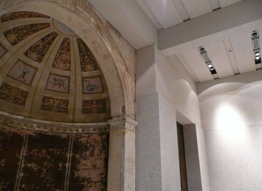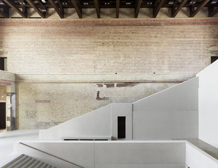 Контраст такого подхода особенно виден на фасаде здания: подлинные фрагменты здания, словно заплатки, чередуются с новой кирпичной кладкой. Также и с двумя крыльями здания: на первый взгляд, они идентичны по пропорциям, но перманентно не повторяют друг друга.