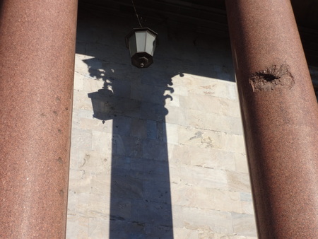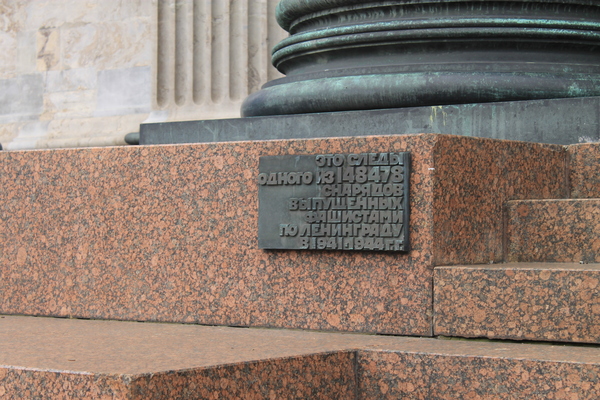 Исаакиевский собор, колонны с отметинами от немецких снарядов / Табличка о следах от снарядов и пуль на колоннах Исаакиевского собора.