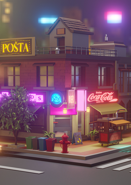 Вечерние улицы города, видны уличные здания, уличные фонари, а также магазины, рестораны и т. д.