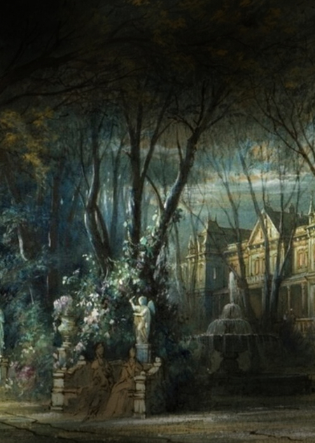 М.Шишков, декорация к постановке «Борис Годунов» Эскиз декорации. Сад в Самборе. Россия, 1870 г. Бум., акварель, гуашь, тушь, чернила орешк., кисть, перо