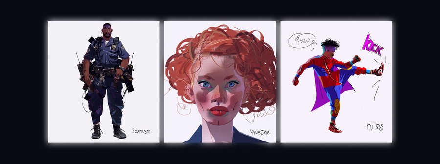 Концепт-арты Человека-Паука, Майлза Моралеза, а также прочих персонажей для «Человека-Паука: Сквозь Вселенные»