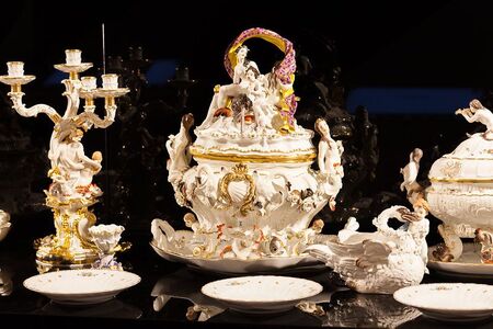 Севрская мануфактура во Франции в XVIII веке выпускала фарфор с гротескными мотивами, стилизованными под рококо: амурчики, лебеди, змеевидные формы и растительные завитки украшали вазоны, канделябры и панели, создавая изящные и фантазийные композиции.