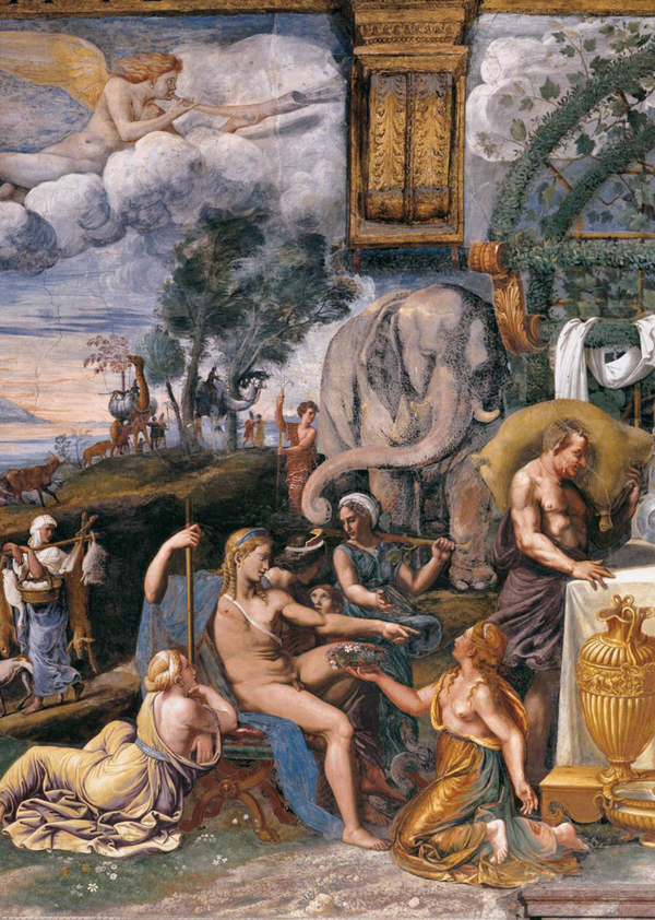 Палаццо дель Те в Мантуе, построенный в 1525–1535 годах по проекту Джулио Романо, представляет собой один из самых ярких примеров ренессансной интерпретации гротеска в монументальной архитектуре. В росписях залов, особенно Зала Психеи, декоративные композиции сочетают фантастические существа, иллюзорные архитектурные элементы, гибридные фигуры, мифологические сцены и богатый орнамент, воплощая характерную для эпохи игру с формой, масштабом и смыслом.