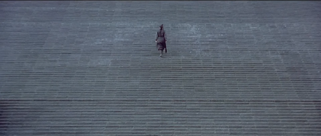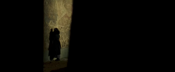 В кадре преобладает черный цвет, который в данной сцене символизирует власть и закон. Композиция кадров с дворцом строго симметрична. Огромное пространство дворца состоит из горизонталей и вертикалей, которые как будто запирают персонажей внутри. В сцене, где герой поднимается по лестнице, мы не видим ничего, кроме ступеней, в кадре нет перспективы, поэтому герой снова оказывается заперт в клетке пространства. На фоне дворца всё кажется маленьким и незначительным, его черная доминантная архитектура давит на персонажей своим весом.