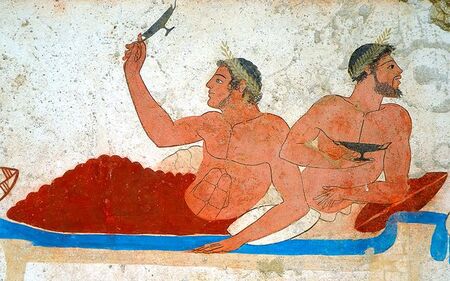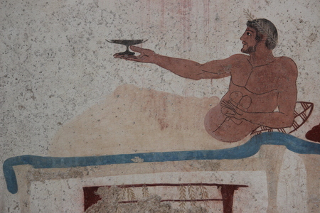 «На внутренней стороне крышки саркофага „Гробницы ныряльщика“ изображен юноша, ныряющий с некоего возвышения в море, обозначенное странно вспухшей зеленовато-голубой массой. Возможно, что оно определялось распространенным в конце VI в. до н. э. мистическим учением о душе человека, посмертно погружающейся в мировой океан. Возможно, это связано с ритуальными мотивами очищения». В росписи используются белый, коричневато-вишневый, более светлый красновато-терракотовый, голубой, розовый и черный цвета. Мастер уже отказывается от условного черного силуэта и обращается к более близкому природе человеческого тела красноватому тону. Все большее значение приобретают те атрибуты, те предметы, которые конкретизируют общий тип, общий характер действия человека: пиршественные ложа, чаши, музыкальные инструменты в сценах пиршества у мастера росписи «Гробницы ныряльщика». Это уже элементы конкретной предметной, бытовой и природной среды. (Интернет-ресурс studfile.net)