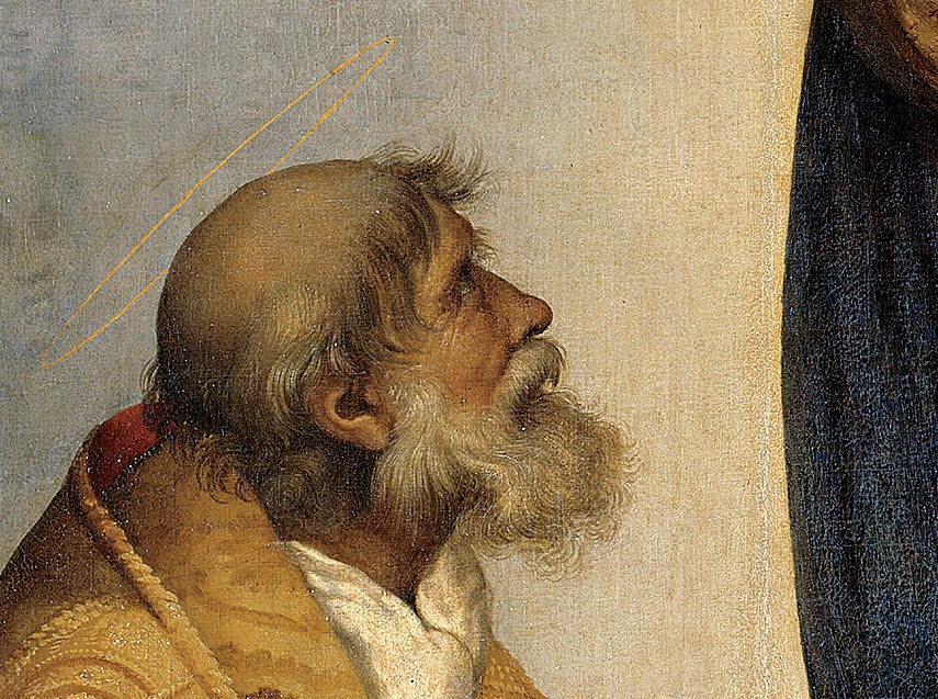 Папа Сикст II: прижимает крест (символ веры и Спасителя) к груди и при этом смотря на Младенца Христоса и Мадонну, что может означать надежду на силы Младенца Христа.