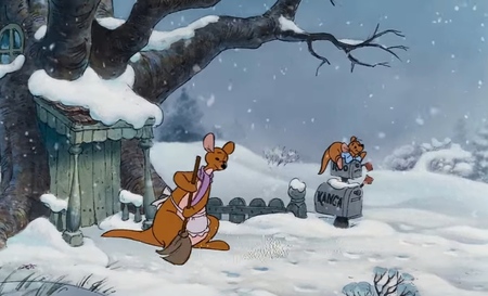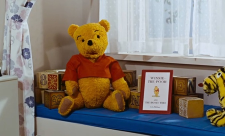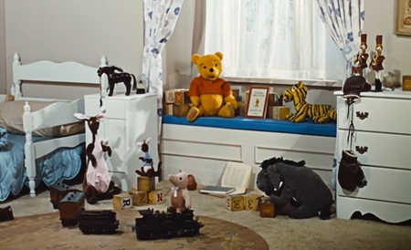 Мультфильм начинается с комнаты Кристофера Робина. Помещение пестрит интересными вещами — трехколесным велосипедом, большим барабаном, кубиками на полу, лошадью-качалкой, книгами на стеллажах, яркими мячами, деревянными солдатиками. Среди этого разнообразия образов и форм находятся главные герои предстоящей истории в виде мягких игрушек. За исключением нескольких персонажей, речь о которых пойдет позже, зритель может увидеть желтого медвежонка в красной футболке, молчаливого ослика, полосатого поросенка, семейство кенгуру, хвостатого тигра.