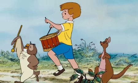 Красный цвет в мультфильме позволяет выделить главных героев — Винни-Пуха и Кристофера Робина. В отличие от мишки, Кристофер Робин появляется только ближе к концу каждой истории, чтобы помочь друзьям. И хоть в оригинальном произведении он играет важную роль, в адаптации Диснея его, скорее всего, стоить назвать второстепенным персонажем. Из-за этого красных элементов нет непосредственно в его дизайне, однако есть другие предметы, которые помогают показать его важность в истории. Например, красный барабан.
