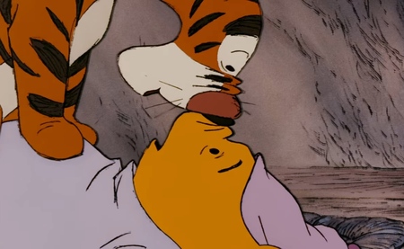 Наивный и добрый характер героя раскрывается в сцене знакомства с Тигрулей. Винни-Пух не выставляет незванного гостя за порог, несмотря на поздний час, а выслушивает истории про Слонопотама, отчего ему позже даже приснится кошмар. Медвежонок также предлагает Хрюне пожить у него, когда тот соглашается отдать свой домик Филину.