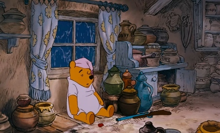 Пристрастие к сладкому заметно не только по поведению персонажа, но и по его дому. В берлоге огромное количество различных горшков из-под меда, а на стене перед кроватью висит в рамке картина с пчелой. Занавески с желтыми цветами, скорее всего, также отсылают к насекомым, которые делают любимое лакомство медвежонка.