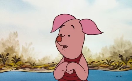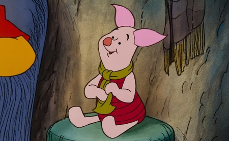 В движении активно работает голова. Мягкий отыгрыш ушей при этом дополняет общую траекторию и показывает нерешительность и нервозность. Также эти качества подчеркивает сцена, где Хрюня от переполняющих эмоций непрерывно теребит край салфетки на шее и смотрит в пол, словно боясь признать свои истинные переживания. Это действие напоминает пластику Скромника из «Белоснежки и семи гномов», который также в порыве чувств закручивал длинную бороду.