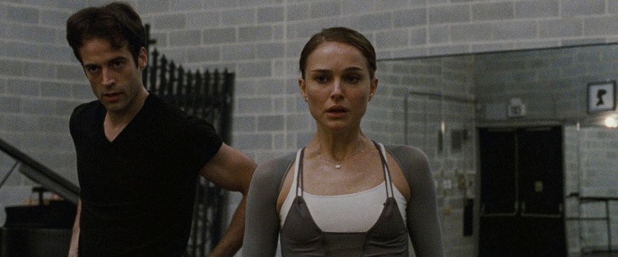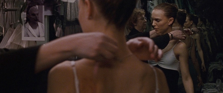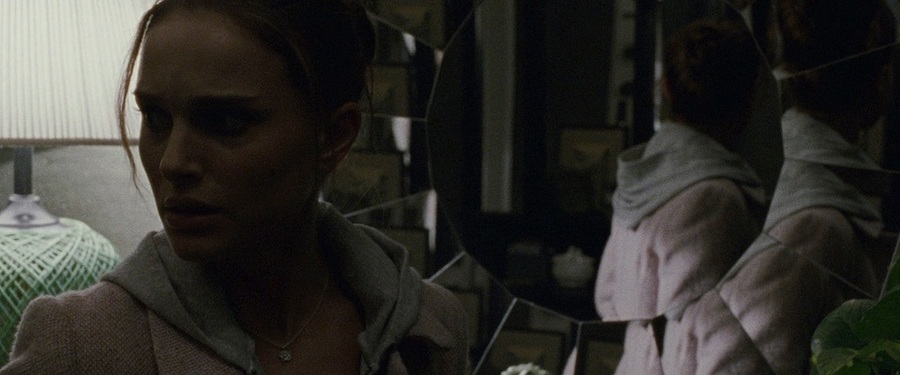 Аронофски создает сложную визуальную метафору психического распада через систему зеркал и отражений. Каждая сцена с зеркалом это этап утраты контакта с реальностью — от первых тревожных взглядов до полного несовпадения с собственным отражением. Режиссер использует черно-белую цветовую бинарность как визуальное воплощение внутреннего дуализма Нины, ее борьбы между «белым» и «черным» лебедем