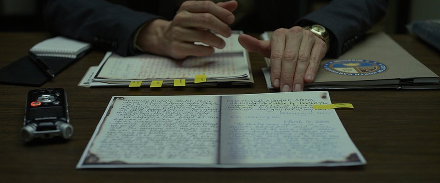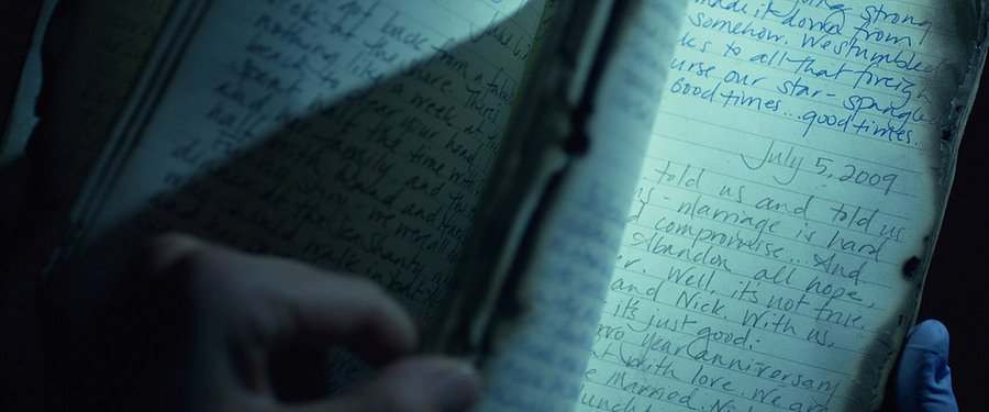 Дневник становится визуальной метафорой расщепления личности — идеальная внешняя оболочка скрывает патологическую внутреннюю реальность