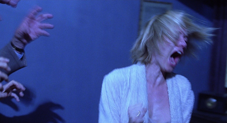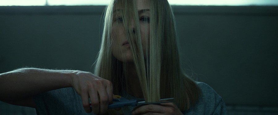 Режиссер использует холодную синюю цветовую палитру для передачи эмоциональной отстраненности, контрастирующую с теплыми тонами, создавая эффект нарастающей психической нестабильности.