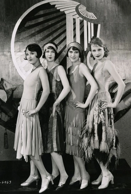 Флэпперы — символ новой эпохи. Эти молодые американки 1920-х демонстрировали энергичную свободу и порой шокировали современников своими поступками. Их гардероб стал воплощением перемен: простые прямые платья с опущенной талией, доходящие до середины икры, без корсетов, в сочетании с чулками, узкими туфлями на каблуках, шляпкой-клошем и длинными бусами.