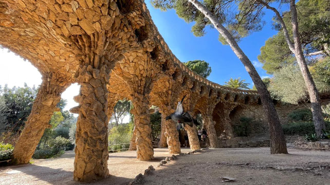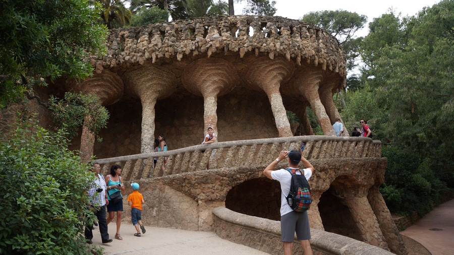 Удивительный парк, спроектированный Антонио Гауди. Колонны-сталактиты и волнообразная скамья демонстрируют парадокс модерна: форма следует за природным прообразом, но конструктивно остается традиционной. Скамья, несмотря на пластическую сложность, — это обычная каменная кладка, покрытая мозаикой. Гауди использует природу как театральный реквизит, создающий иллюзию естественного ландшафта. Очень часто видна четкая параллель с конструктом скелета.