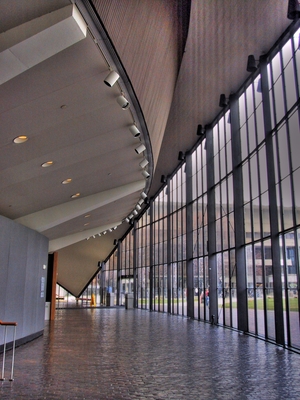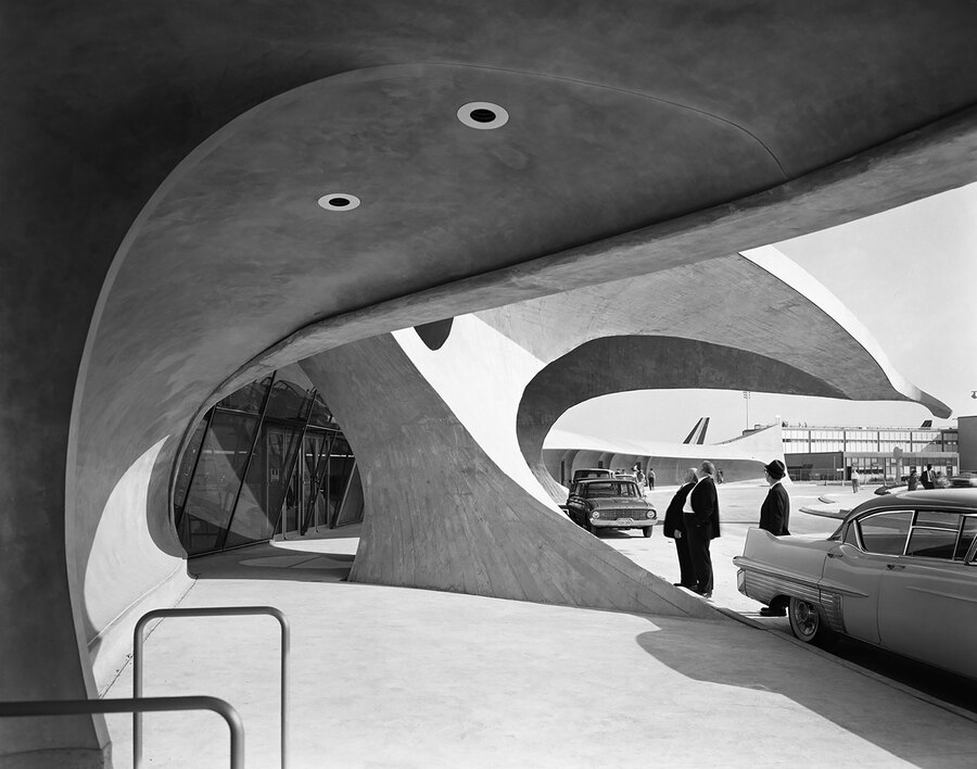 У Ээро Сааринен здание — это не функциональная коробка, а архитектурная икона. Бетонные оболочки, имитирующие птицу в полете, создают тотальную среду, где внешняя форма диктует организацию внутреннего пространства. Однако за этой пластической свободой стоит колоссальная инженерная работа — форма следует не только образу, но и возможностям нового материала.