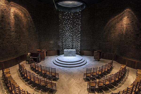 У этого же архитектора есть ещё один интересный пример. Сложная кривая бетонной оболочки демонстрирует переход от декора к структурной выразительности. Здесь уже нет фасада-маски — конструкция сама становится выразительным элементом, хотя и сохраняет символическую нагрузку.