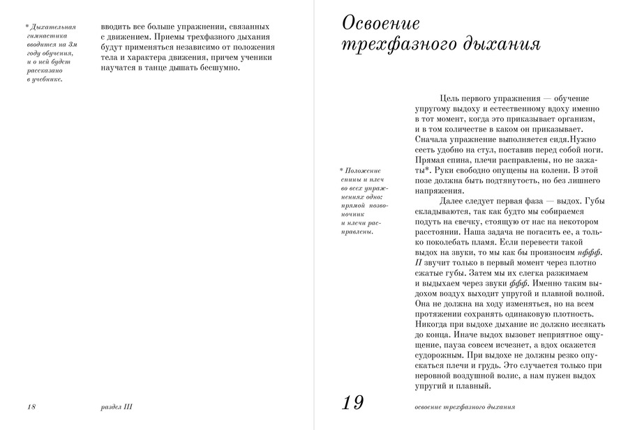 Серия учебно-методических пособий для СПО искусства и культуры, состоит из 4х частей, разделенных по году обучения. В книге раскрывается метод трехфазного дыхания. История его появления связана с людьми, болевшими астмой и туберкулезом, и нашедшими средство борьбы с болезнью в описанных дыхательных упражнениях. Впоследствии эта методика послужила основой для хореографов, вокалистов и актеров.