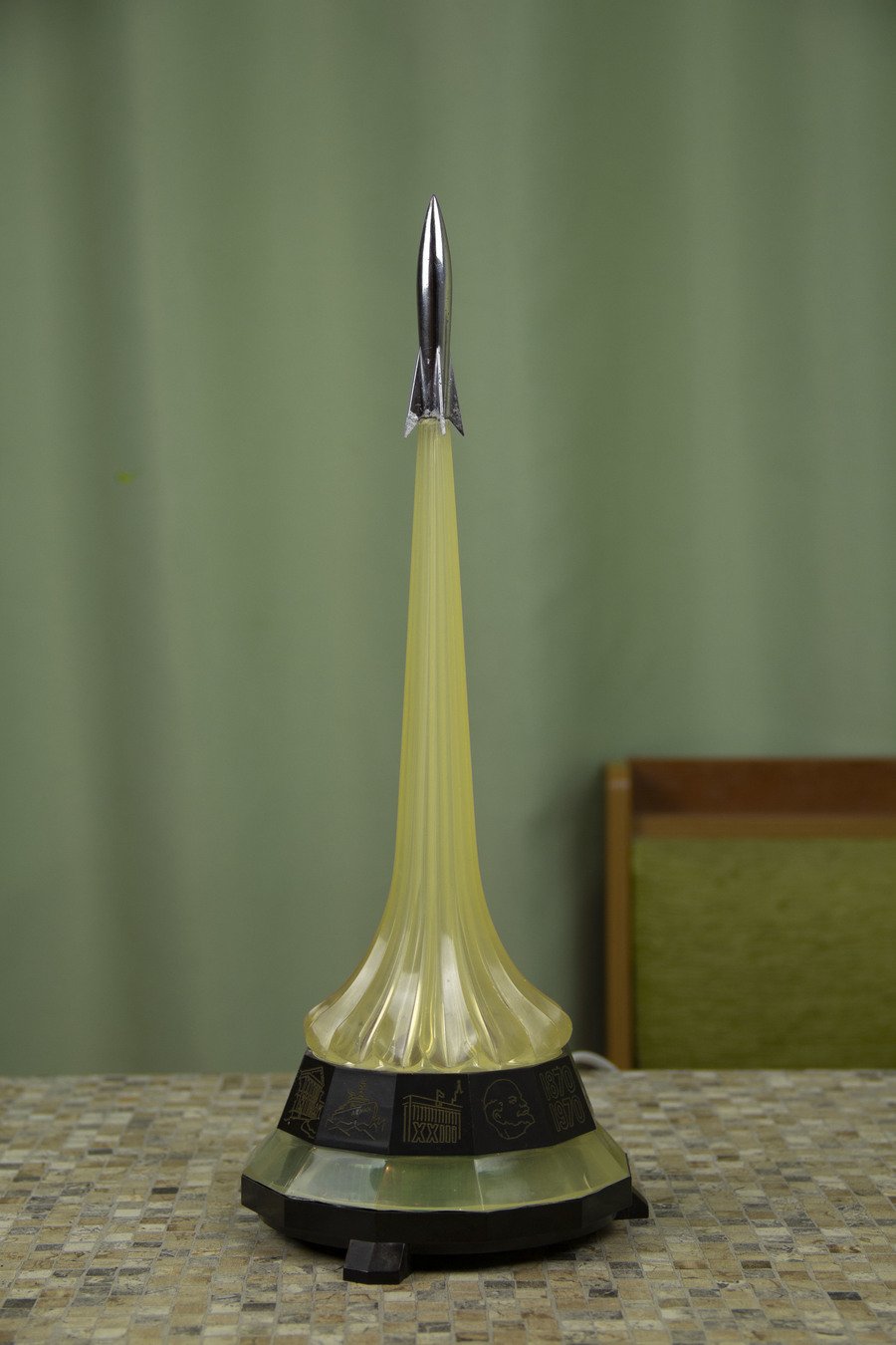Ее дизайн напоминал ракету, кружащую над Землей и освещающую СССР. Это был не только внешний вид, но и ночник, который часто использовался для демонстрации космической эры. Некоторые версии имели металлические или пластиковые ракеты и украшения, похожие на монумент «Покорителям космоса».