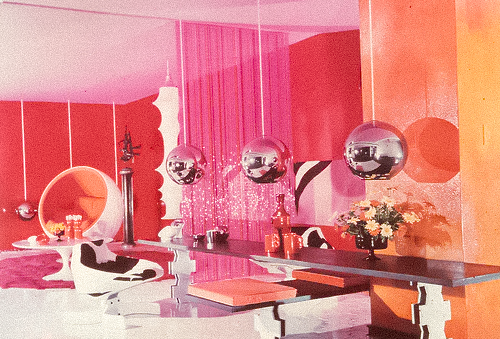 Космический стиль, 1960-е. Доминируют высокие технологии и яркие цвета, футуристические формы и отражающие поверхности.