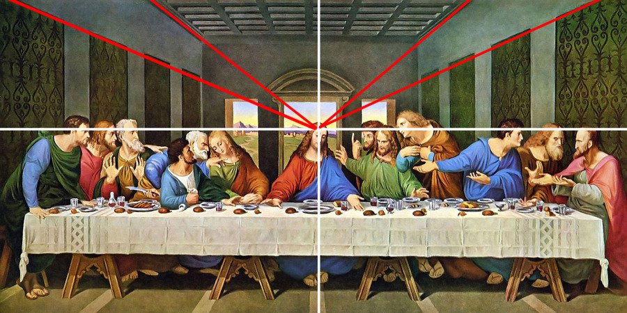 Здесь наблюдается чёткая структура композиции. Автор обращает наше внимание на Иисуса, на фигуру которого приходится точка свода перспективы. Рядом расположены фигуры апостолов в группах по три человека.