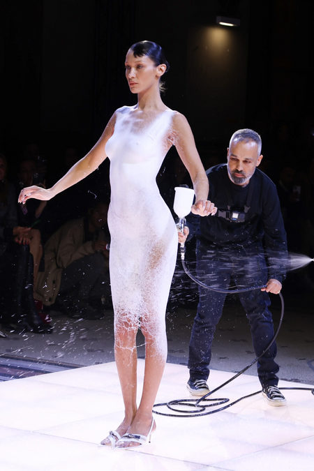 Беллa Хадид, которая закрывала шоу, появилась на подиуме в одном белье. К модели подошли мужчины в черном и стали распылять на нее загадочную белую жидкость. Сначала все решили, что это какой-то боди-арт — но ничего подобного: «краскa» застылa и превратилась в настоящее платье! Гости Парижской недели Моды наблюдали за созданием шоу, тем самым стали ближе к событию и к самой Бэлле Хадид. Ричард Шехнер пишет «Внимание к процедурам создания театра было, как мне кажется, попыткой ритуализировать перформанс, заставить театр совершать действенные поступки.» (Ричард Шехнер 2020, с. 119).