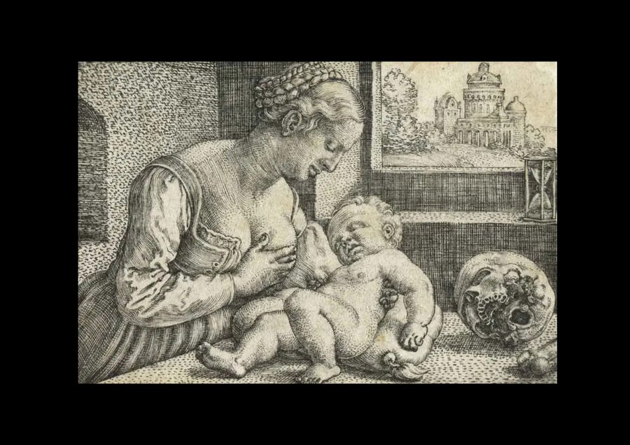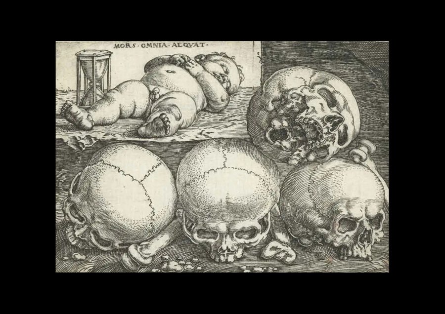 Бартель Бехам. Спящий ребенок с песочными часами и четырьмя черепами. 1512–1540 гг.// Бартель Бехам. Мария с младенцем в груди и черепом. 1512–1540 гг.