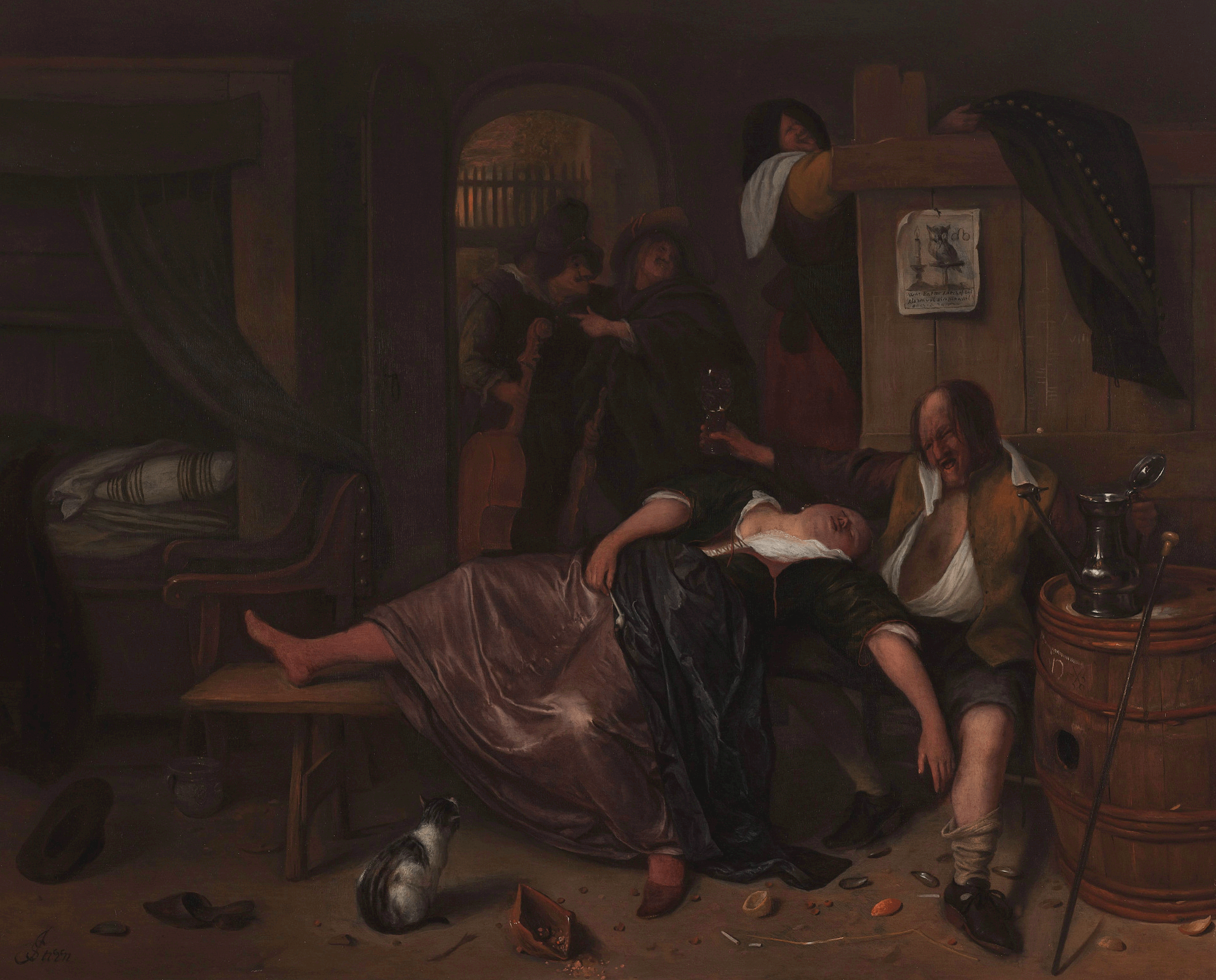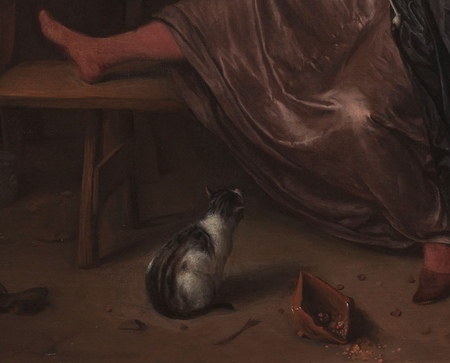 Анализируя данную работу Ян Стена, можно заметить изображение статичной кошки. Образ наблюдающего животного контрастирует с развалившимися людьми на заднем плане.