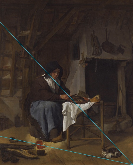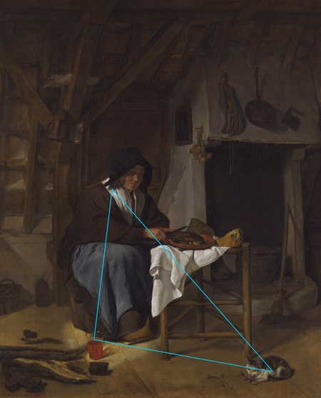 Если расставить акценты: подсвеченный стакан, кошка, старуха — то объекты соединяются в почти правильный треугольник.