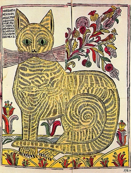 Кардинально отличающиеся изображение кота в лубочной технике позволяет увидеть народный взгляд на символический образ животного. Жесткие, резкие штрихи и яркие цвета подчеркивают простоту работы и делают изображение более комичным.