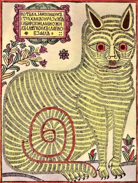 «Котъ казанскои умъ асътраханъскои а разумъ сибиръскои а усъ с уса с теръскава славън жилъ слатъко елъ слапъко ибзделъ» — гласит надпись на изображении сидячего кота.