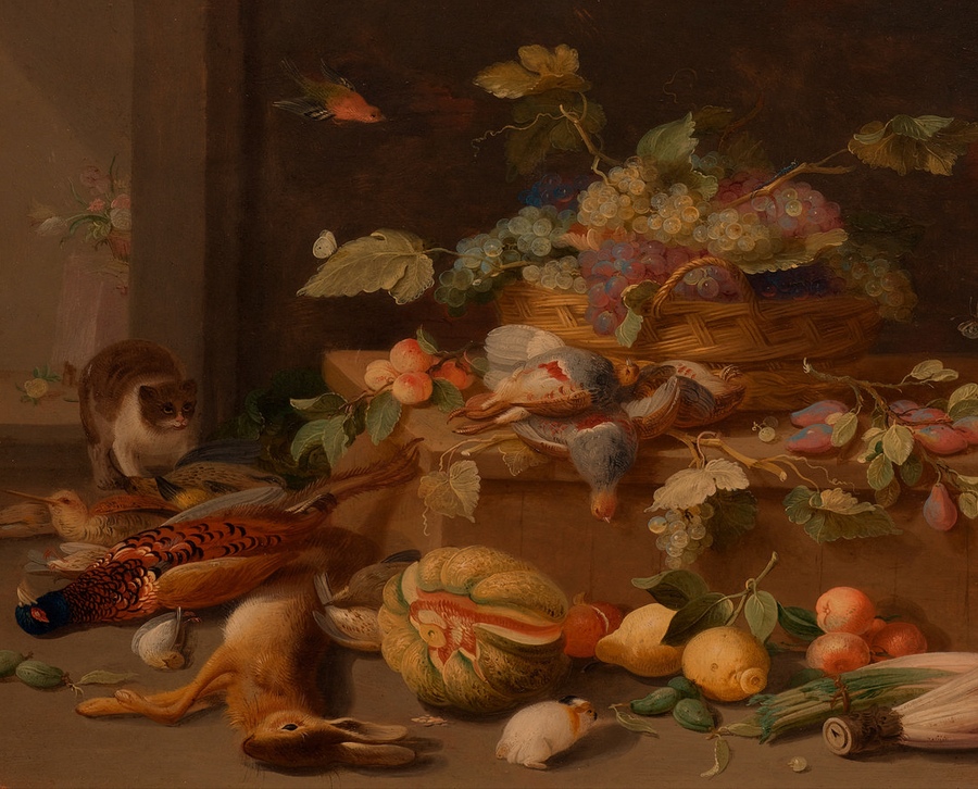 Натюрморт из фруктов с кошкой и дикими животными / Ян Ван Кессель Младший / XVII в.