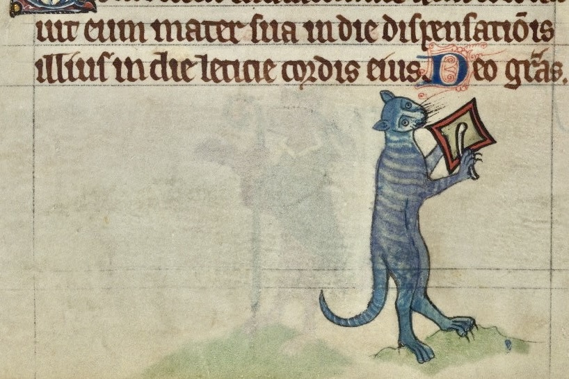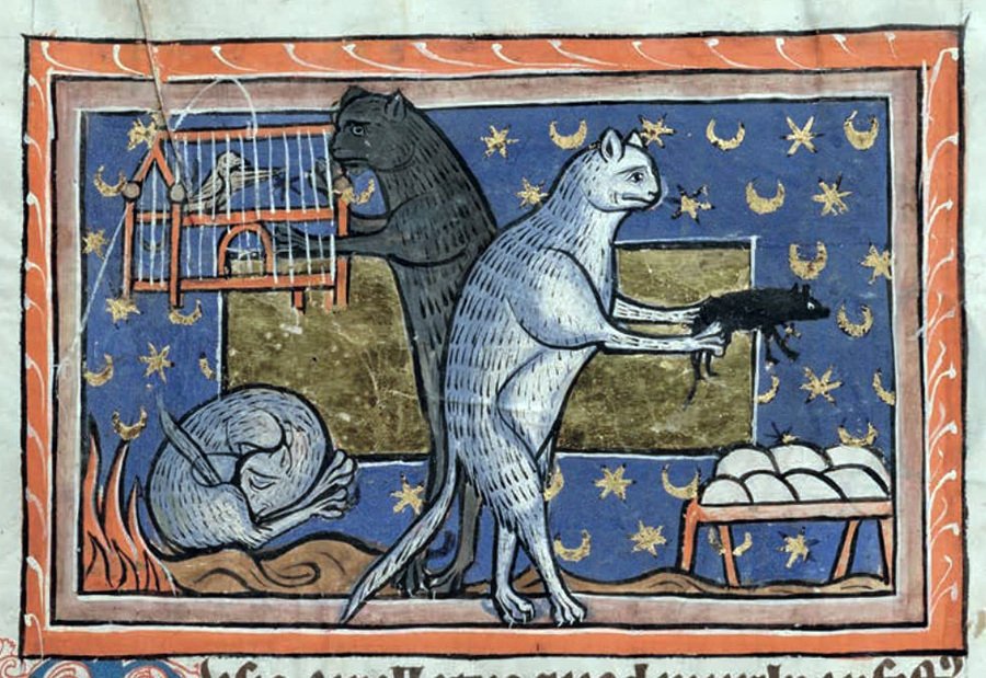 Одним из примеров является иллюстрация из рукописи середины тринадцатого века, где кошка в сидячей позе изображена в окружении двух мышей.