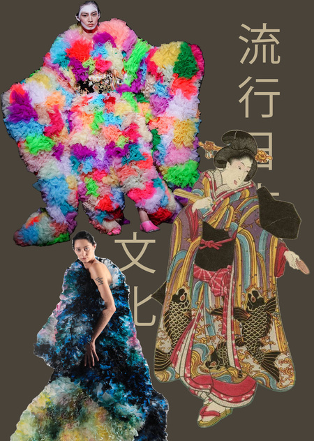 (1) Гравюра японской гейши/Утагава Куниёси/период Эдо (2) Работа современного японского дизайнера Tomo Koizumi/Коллекция «2024SS Paris»