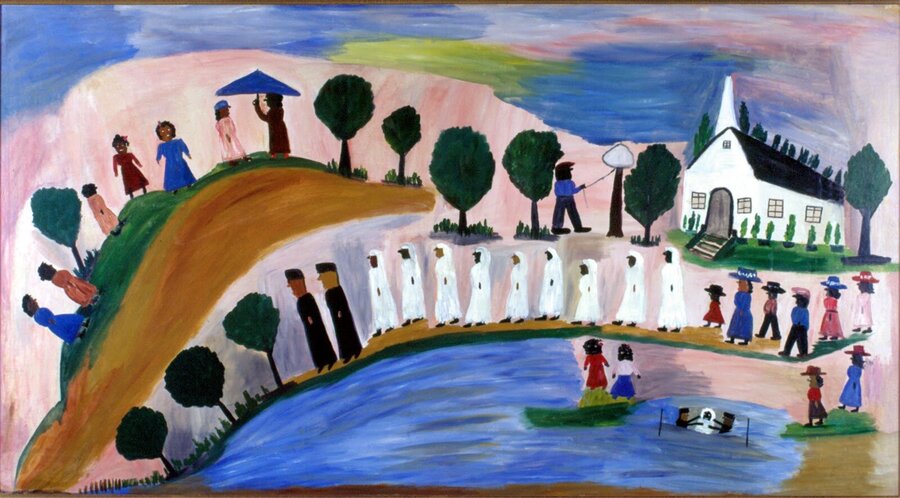 Clementine Hunter 1 –– Baptism, detail of African House Murals, 1955; 2 –– Washday, 1950s; 3 –– Window Shade, 1950s