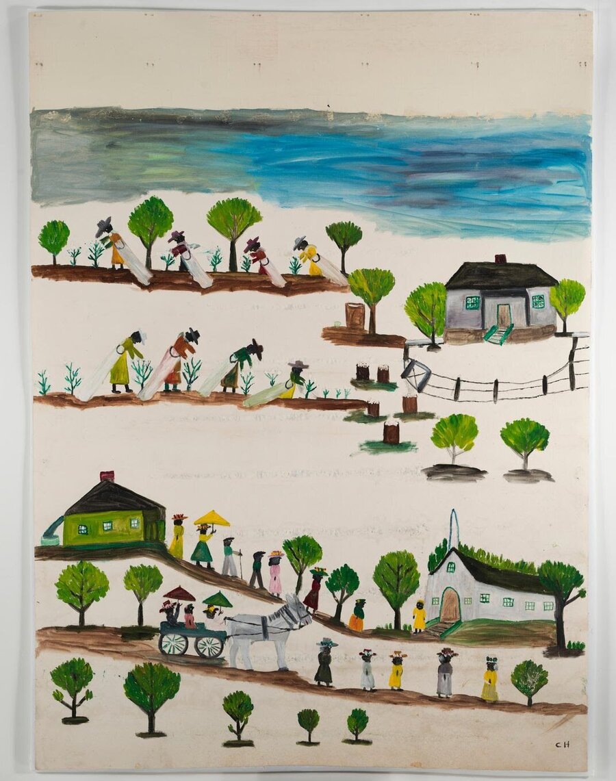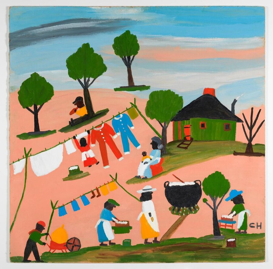 Клементина Хантер (1886–1988) — афроамериканская художница из Луизианы, чьи «картины памяти» запечатлели жизнь общины фермеров и рабочих плантации Мелроуз на реке Кейн. Не умея читать и писать, Хантер начала рисовать в зрелом возрасте, передавая простые радости своей малой родины. Её работы наполнены светом и порядком, художница изображала сцены сбора урожая, стирки белья, церковных собраний, праздников — яркий и организованный мир, где люди занимаются общим делом и наслаждаются компанией друг друга. В композициях Хантер множество цветов и деревьев, фигуры расставлены ровными группами — всё словно аккуратно расставлено, как в детской диораме. Эта наивная упорядоченность и яркие краски придают её полотнам вид счастливого, почти невинного мира. Хотя реальная жизнь афроамериканцев на Юге была тяжела, в картинах Хантер сквозит дух сопротивления злу, через утверждение красоты. Её идеализированный образ родного места стал тихой формой протеста против несправедливости, отображая мир таким, каким он должен быть.