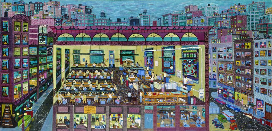 Ральф Фазанелла (1914–1997) — нью-йоркский художник-самоучка и бывший профсоюзный организатор, который посвятил свое искусство рабочему классу Америки. Фазанелла вырос в семье итальянских иммигрантов-трудяг и сам работал на фабриках, в доставке льда, на бензоколонке, что сформировало его мировоззрение. Его полотна — многолюдные панорамы фабричных городов, забастовок, собраний профсоюзов, воскресных улиц — насыщены деталями и символами. Стиль Фазанеллы можно описать так: крупноформатные композиции с «разрезанными» интерьером и экстерьером (он часто показывал одновременно и улицу, и внутренность цеха на одном холсте), яркие цвета и десятки мелких сценок, разыгрывающихся параллельно. Он сознательно отказался от академической перспективы в пользу «народной» повествовательности — каждая фигурка на его картине важна, вместе они образуют единый живой организм. Например, в картине «Dress Shop» (1972) Фазанелла изобразил швейную мастерскую (как ту, где трудилась его мать-иммигрантка) с множеством женщин за работой, увековечив труд швей. «Они часть меня. Думаю, картина показывает чувство к людям, как они живут, что делают — в этом всё дело» — говорил он о персонажах Dress Shop. В другой известной работе, «The Great Strike: Lawrence 1912», Фазанелла изобразил знаменитую забастовку текстильщиков в Массачусетсе: толпы рабочих, лозунги «Lest We Forget» («Чтобы мы не забыли») — художник как бы ведёт хронику героической борьбы предшествующих поколений. Фазанелла использовал индустриальный пейзаж как сцену для драмы рабочего класса, наполненную одновременно болью эксплуатации и надеждой на справедливость.