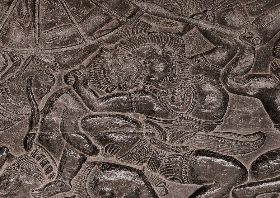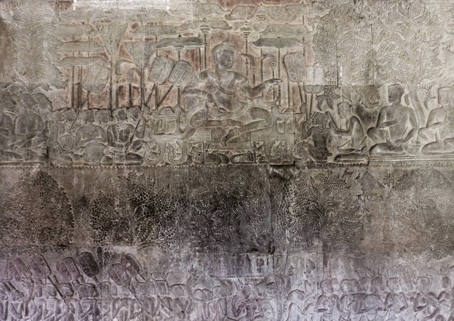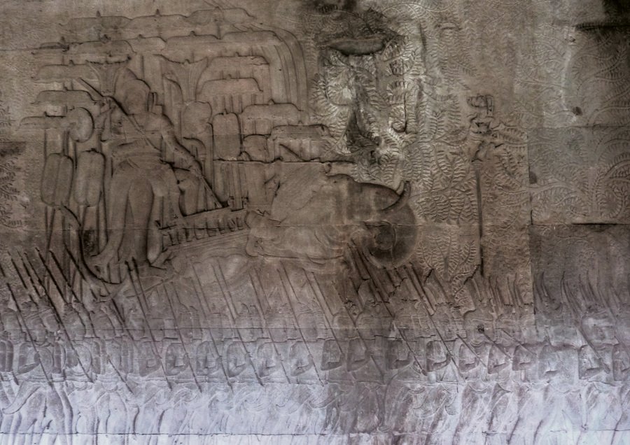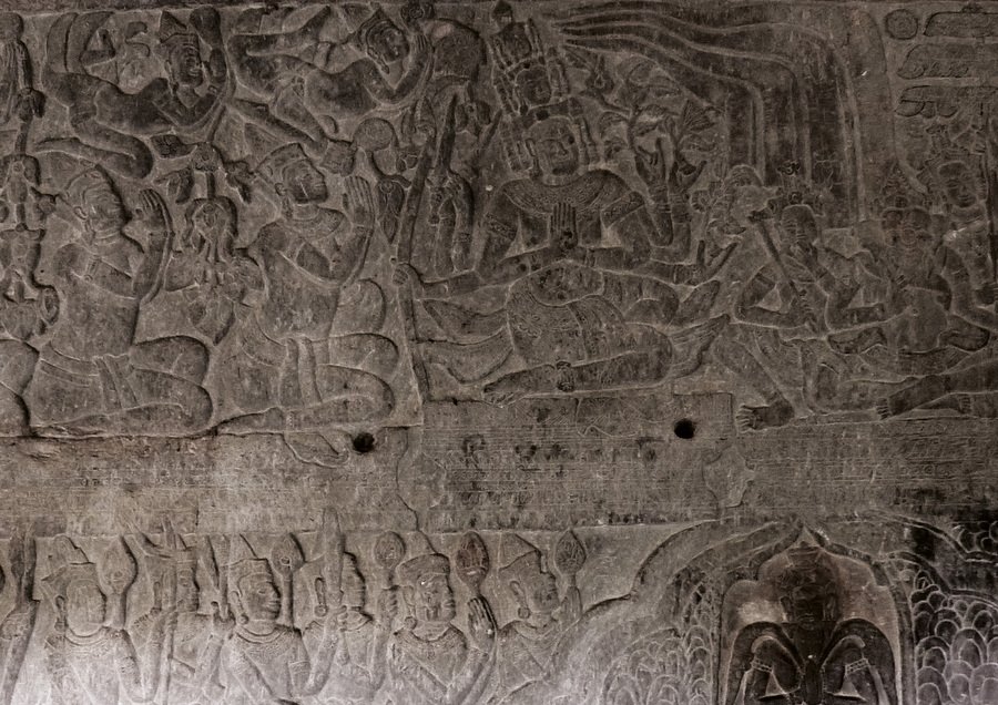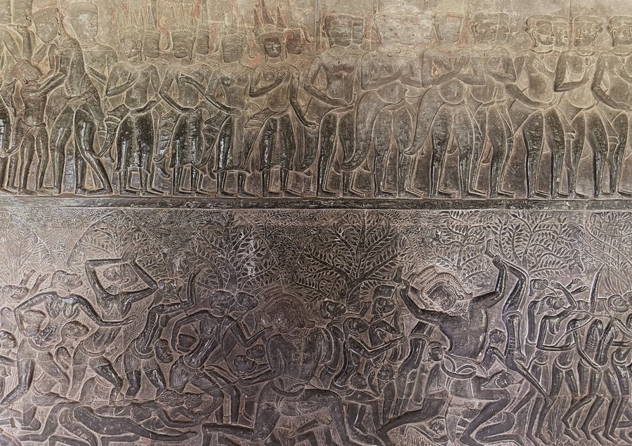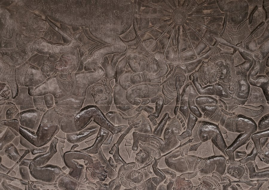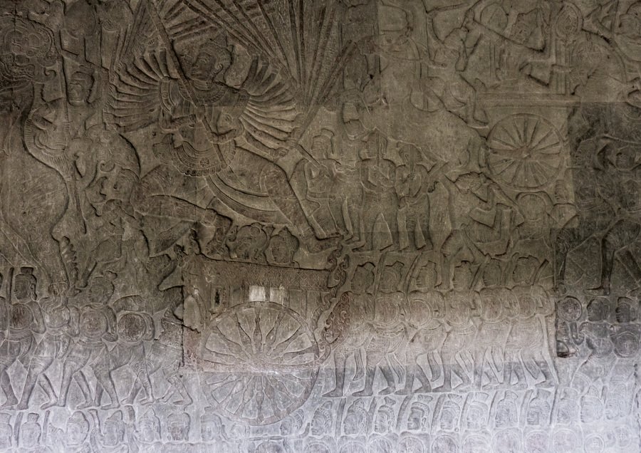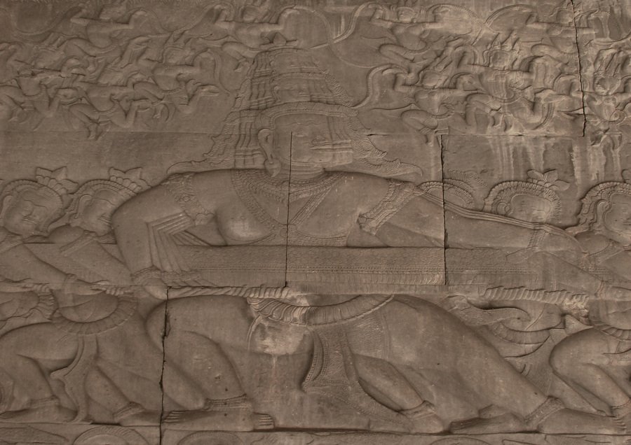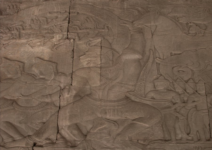 Этот барельеф Ангкор-Вата иллюстрирует один из ключевых эпизодов древнеиндийского эпоса «Махабхарата». Композиция разделена на два яруса, что символизирует противостояние двух армий.