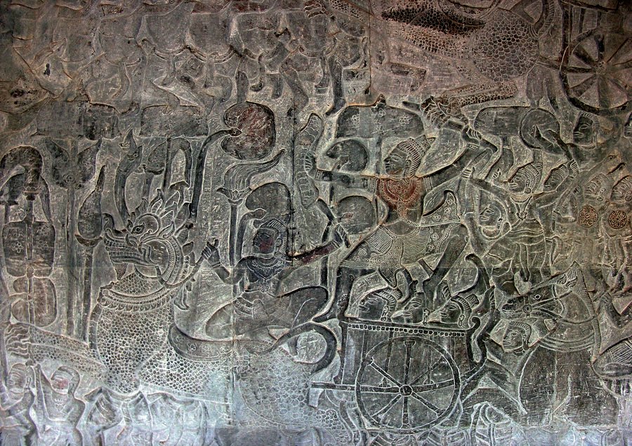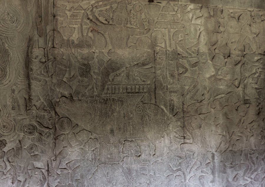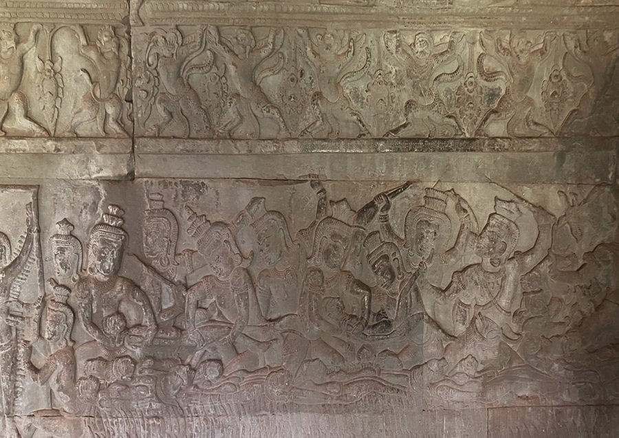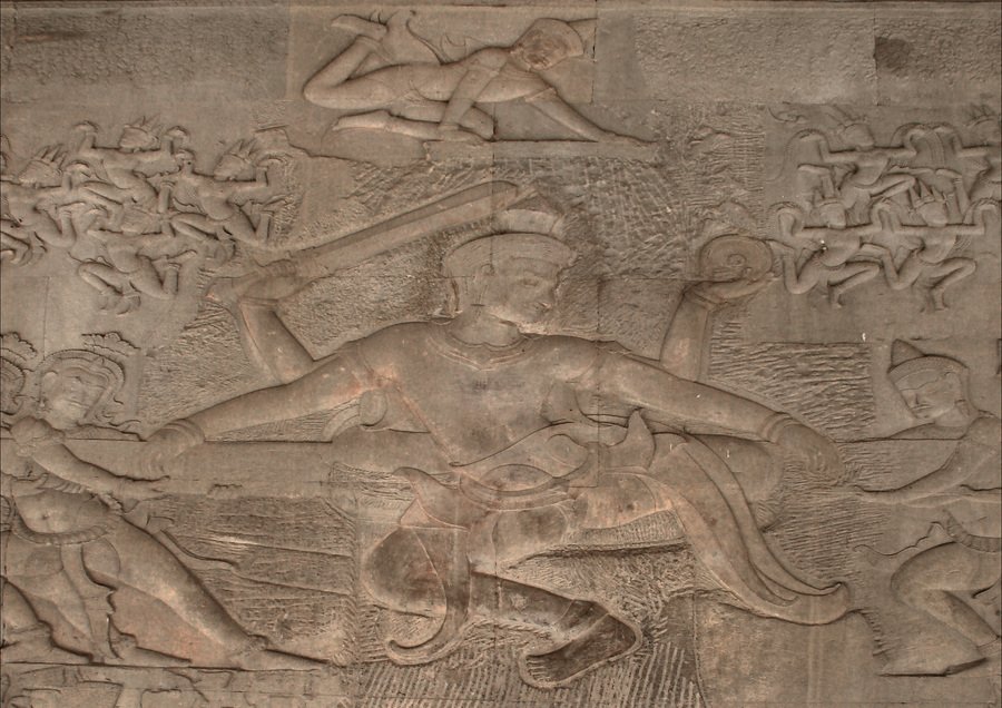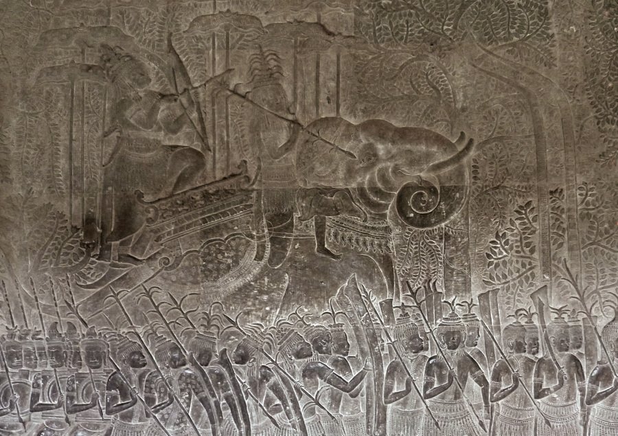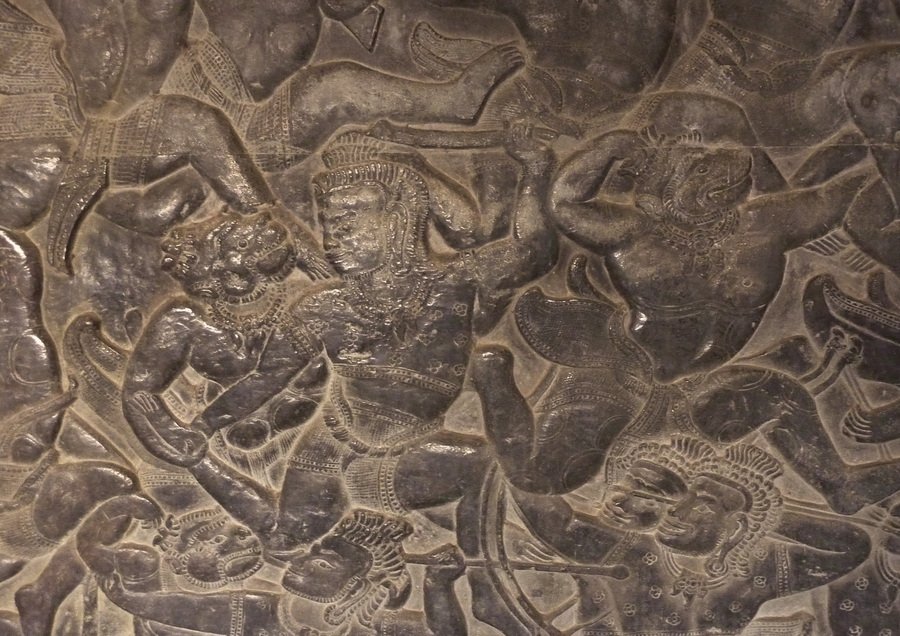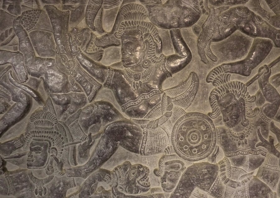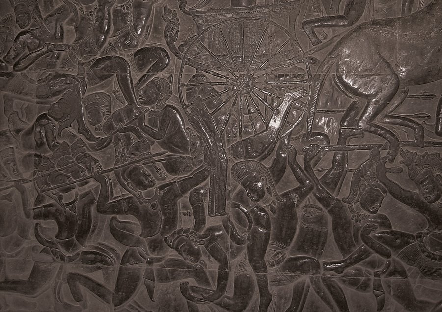 Этот барельеф Ангкор-Вата иллюстрирует один из ключевых эпизодов древнеиндийского эпоса «Махабхарата». Композиция разделена на два яруса, что символизирует противостояние двух армий.